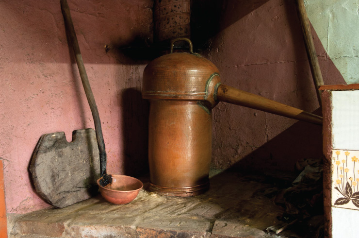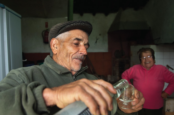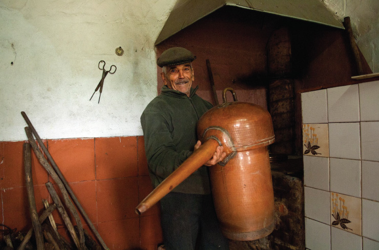 Agostinho Ventura lives with his wife, Isabel Lourenço Martins, in the borough capital, but most of their days are spent at Marianes. It is here they kill time, with their hands in the earth or in the lees from the medronho. Three little chickens, some potatoes, peas, garlic and a little more do not make up a fortune but they are enough to make ends meet. The same thing goes for aguardente: it is a supplement to the couple’s other income. Only living from the land and the mountains is an old formula even though modern times demand modern ways. If in the past you could set up a still in any old place, now cleanliness and regulations are required that Agostinho and Isabel insist on complying with.