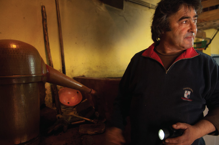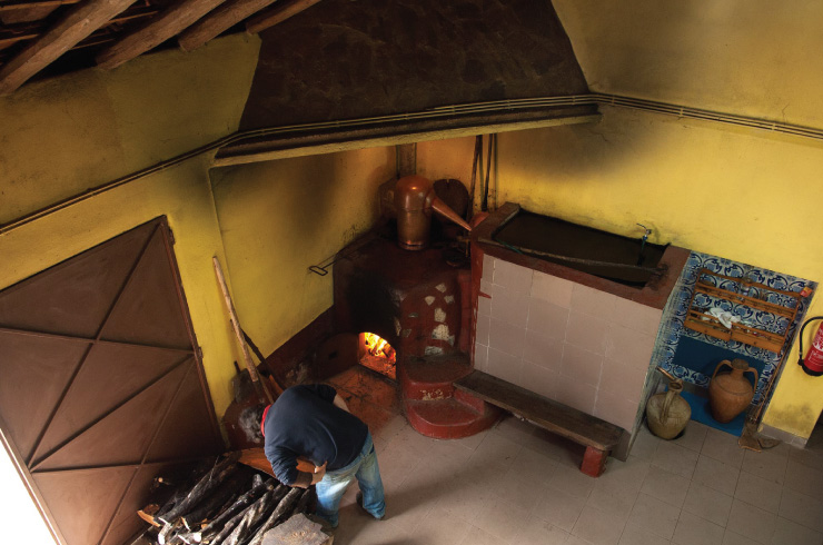 José Miguel Maria has a long career in medronho. He began to accompany his father in the production of aguardente at the age of eight, over four decades ago, and could not have had a better teacher. His father died at the age of 94 and he picked medronho all his life. It is no surprise then that his son has his own specific rules for the preparation of the drink. Instead of a 120-litre boiler, like most of his contemporaries have, he prefers to use a 110-litre one, as he believes the medronho boils better in it. And as far as the wood is concerned, he likes to burn thicker logs as in this way he can keep “ a surer spark”.