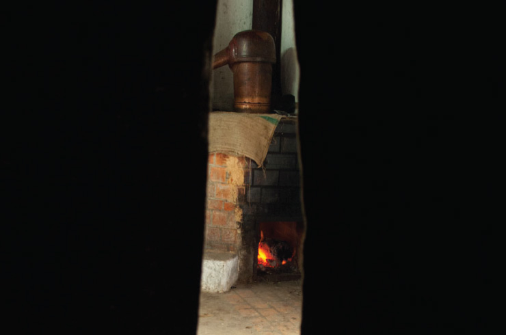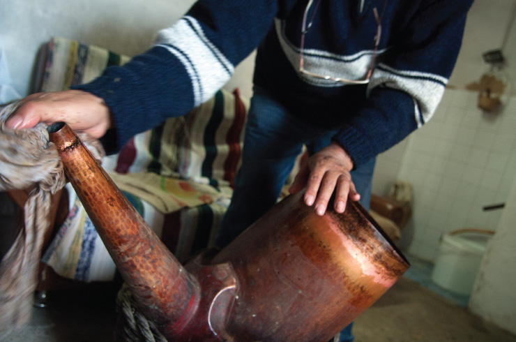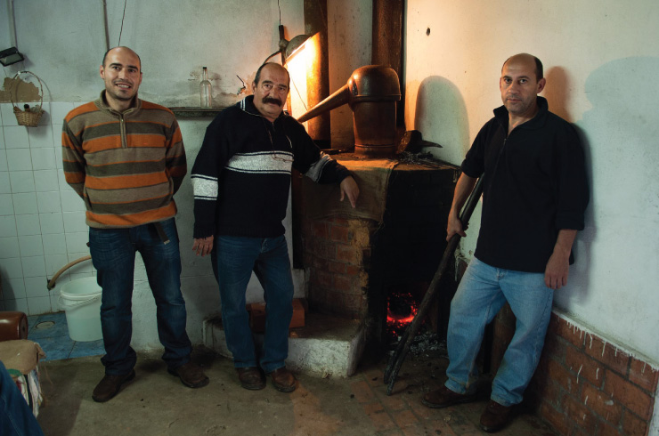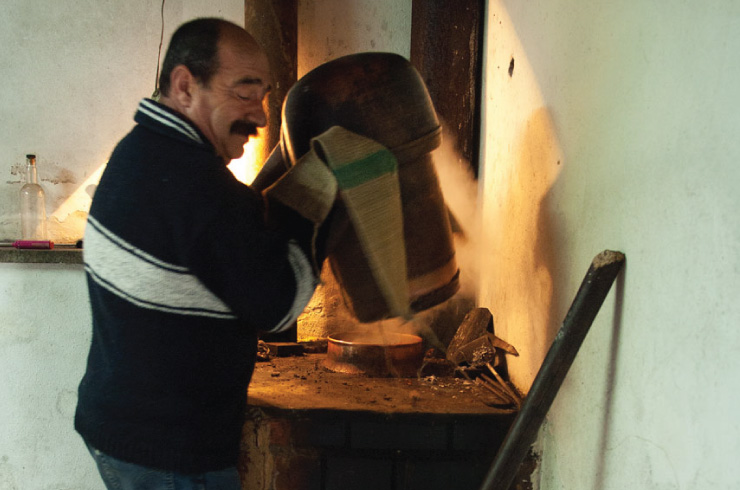 Esmeraldo Tomás Páscoa has been making aguardente de medronho for thirty years, but has been in the business for a lot longer, at least as long as he is old, somewhere over sixty. His father traded in aguardente and smoked ham in Alentejo and in Algarve, and therefore he recalls the times when the medronho barrels were fitted on to the animals’pack saddles and they would travel through hamlets and villages all the way to Odeceixe, Odemira and Cercal to sell their goods. He also recalls his father having bought a truck but as they did not have the roads they have today, part of the journey was still done on foot with the load on their backs.