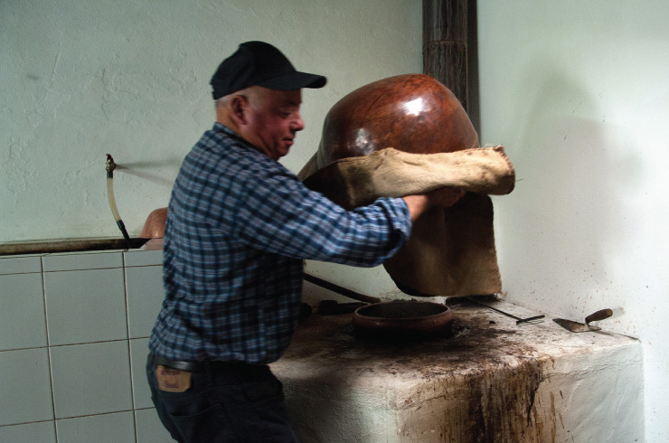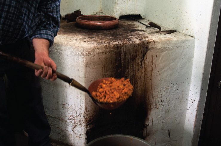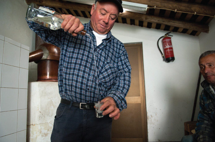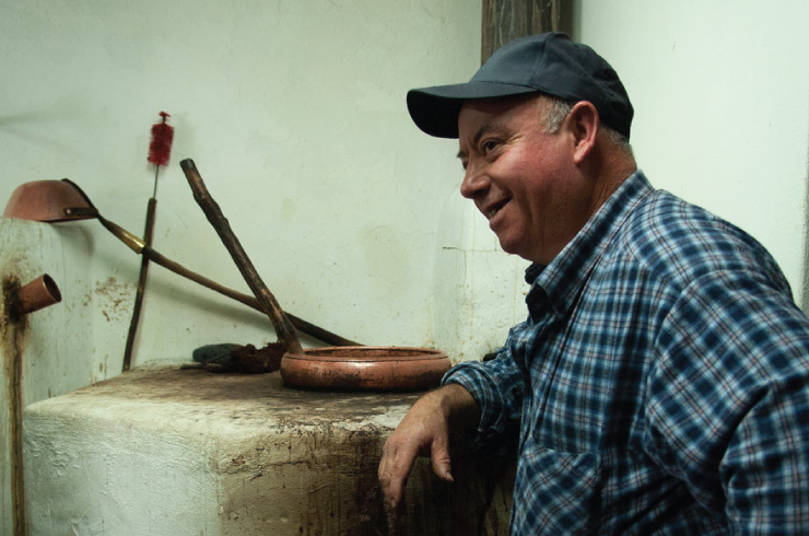 At the Travessa do Vimeirão, between each “boil”, the copper of the still and its corresponding head, as well as the utensil used to take out the lees from the boiler, are very well washed to ensure they do not contaminate the flavour of the beverage. There is only one pause and that is when the aguardente begins to weaken. Then José Elias exchanges the bowl of aguardente for the pitcher of the weak aguardente and in the following hours he passes round glasses full of his aguardente to neighbours and friends.